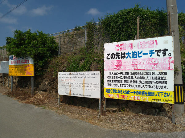 ちょっと分かりにくいですが、大泊ビーチに向かう案内看板が2つあります(手前と奥)。しかも看板に書かれていることに、どこか穏やかではない雰囲気も感じませんか?