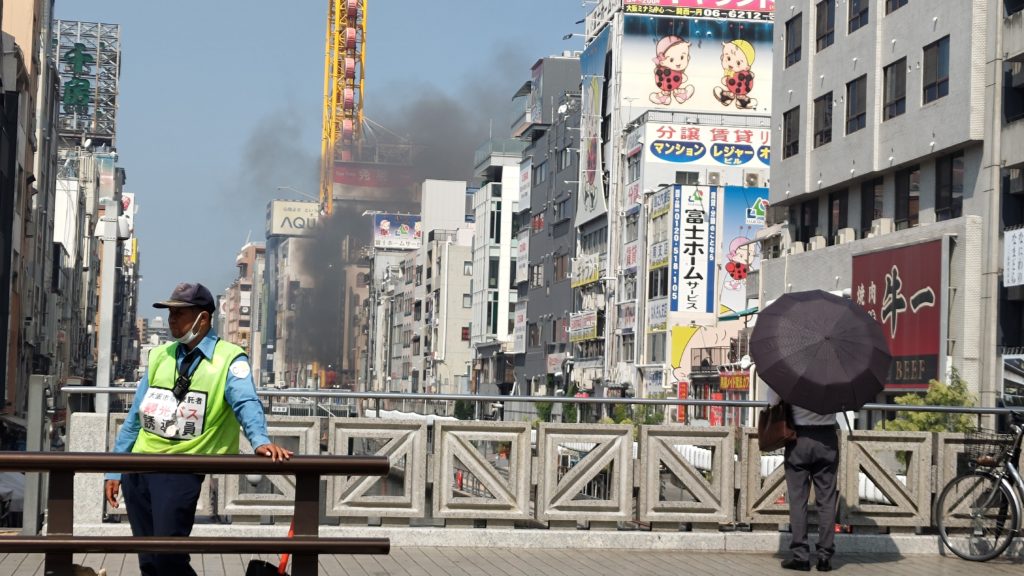 道頓堀川にかかる橋から見た現場からは、かなりヤバそうな煙が上がっています。