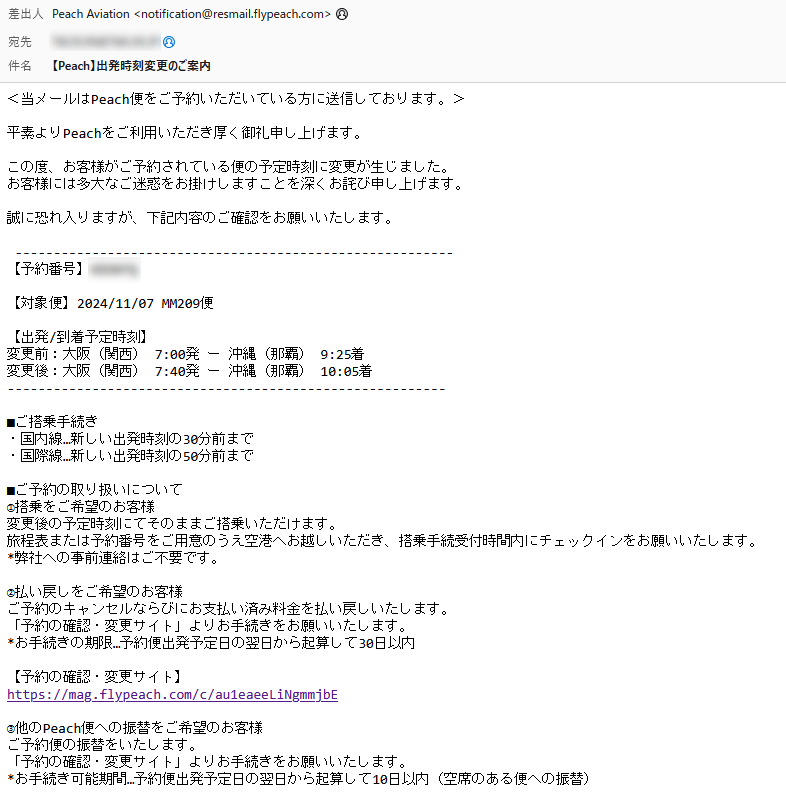 Peachでフライトが変更になると、以下のようなメールが届きます。